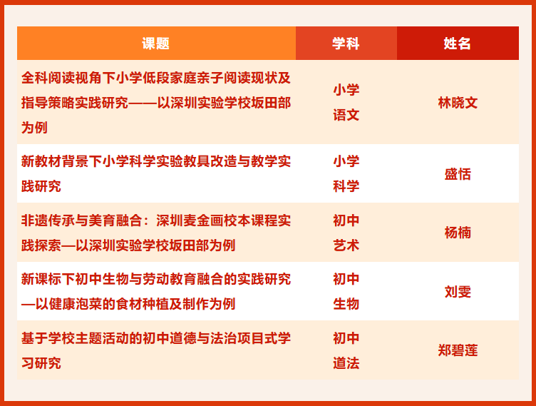 深圳市2025年教育规划课题立项结果已公示,本次坂田部共有5项课题立项。坂田部小学语文科组林晓文、小学科学组盛恬两位老师,初中艺术科组杨楠、初中生物科组刘雯、初中道法科组郑碧莲三位老师的课题获得立项,祝贺立项教师!