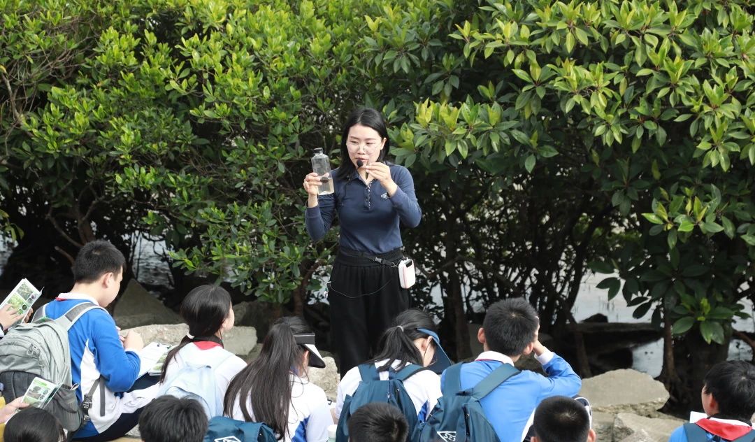 踏入深圳湾公园,同学们仿佛进入了一座天然的自然博物馆。地理老师结合现场环境,讲解了深圳湾的地理位置、地形结构及其在粤港澳大湾区的重要生态地位。生物老师则带领大家观察红树林和候鸟,深入剖析它们之间的生态关系。同学们认真观察红树林错综复杂的根系,了解到这些根系不仅稳固了红树的生长,还为众多生物提供了栖息和繁殖的场所。
