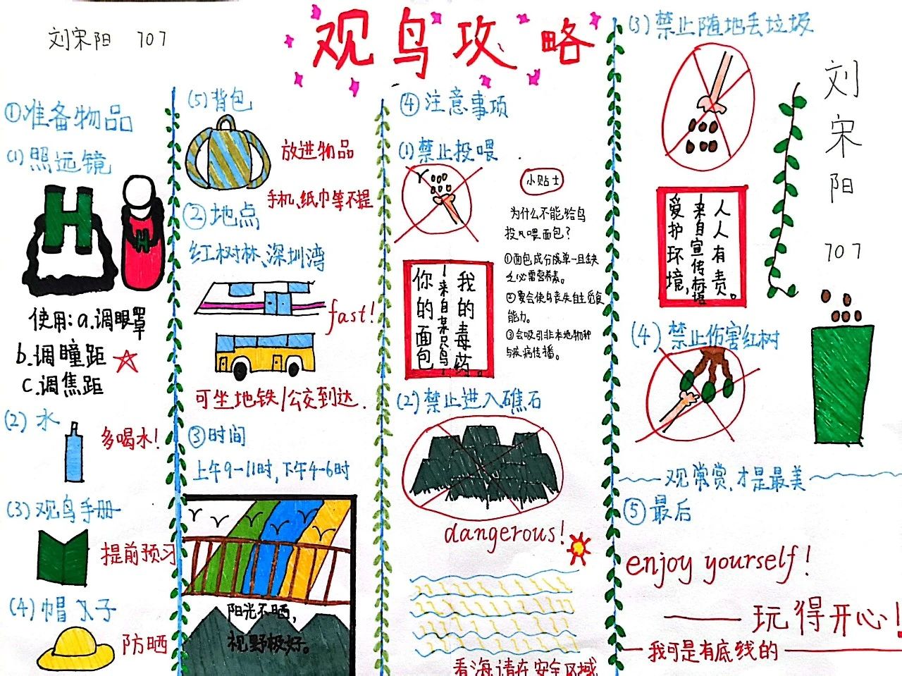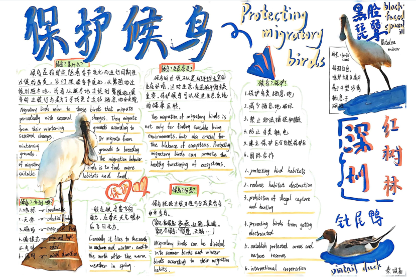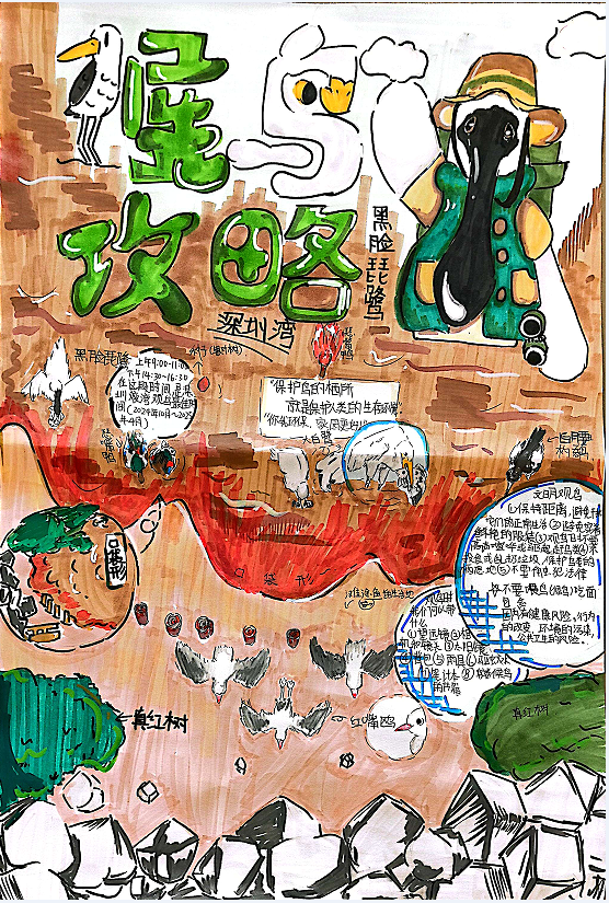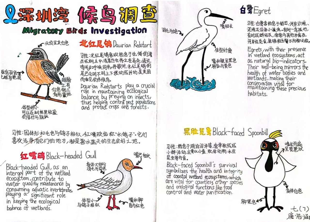 同样的深圳湾公园,不同年级的同学们却有着不同的收获。三年级的同学们绘制鸟类名片,介绍我的鸟类朋友,开启了自然启蒙;五年级的同学们调查红树的朋友圈,绘制红树的食物网,思考了生物间的关联;而七年级的同学们则结合前置课堂知识,对候鸟与红树林生态系统的关系进行了更深入的探究。