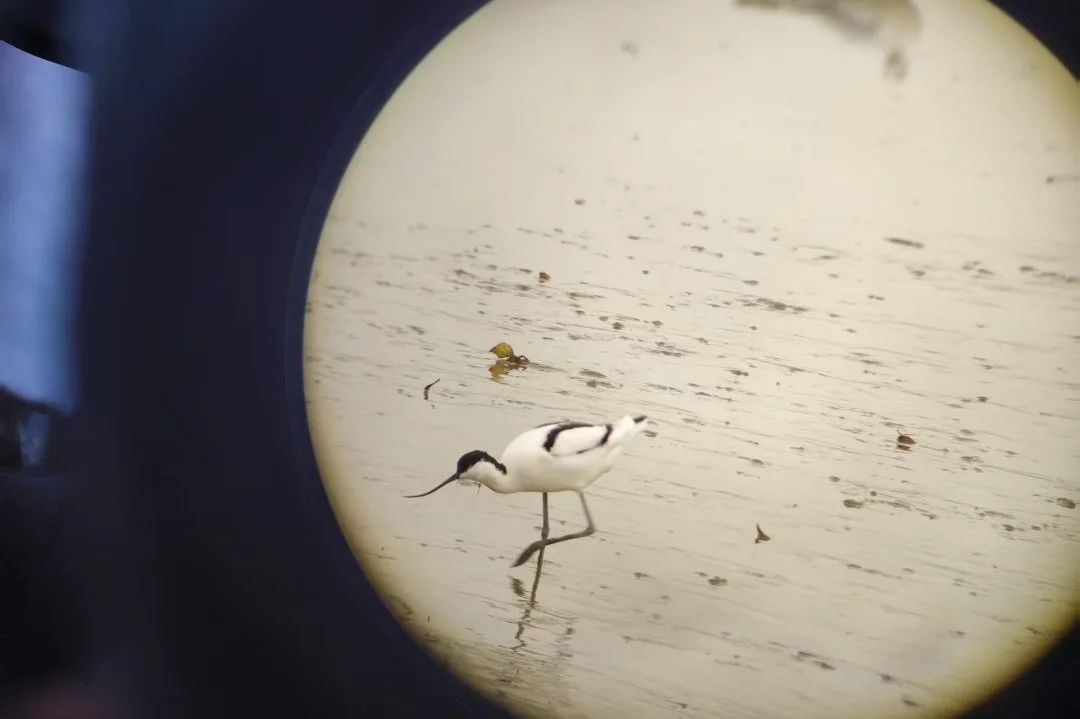 候鸟观察:同学们手持望远镜,专注地观察赤颈鸭、白鹭、黑脸琵鹭、反嘴鹬等鸟类,记录它们的特征和行为。