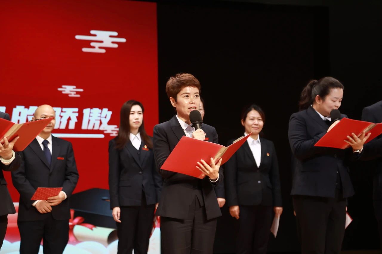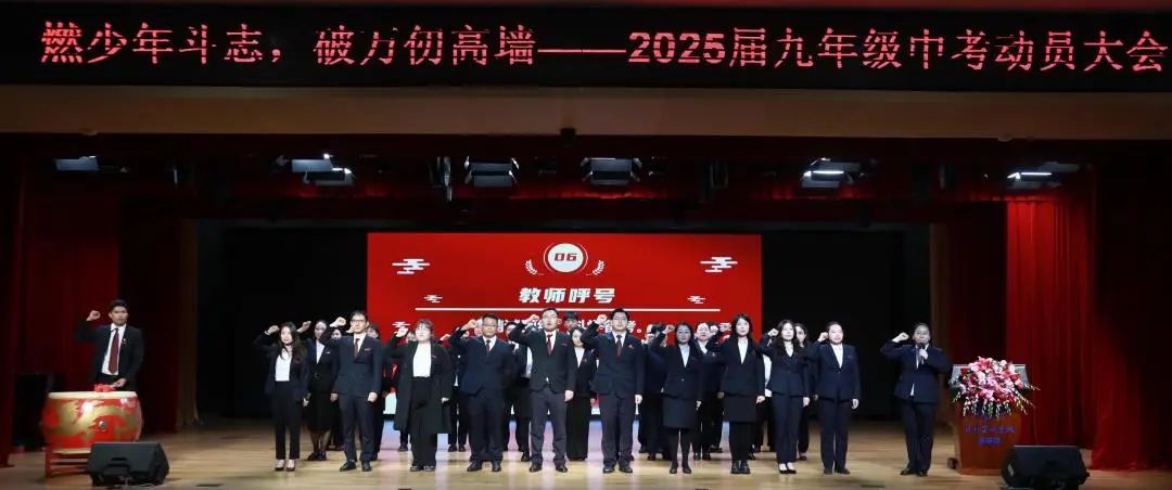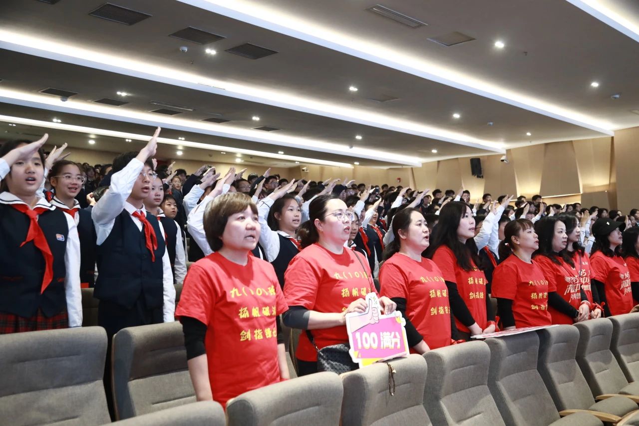 大会尾声,全体九年级教师迈着坚定的步伐登上舞台,他们的目光中闪烁着坚定的信念与无私的奉献精神。在庄严的氛围中,他们高举右拳,铿锵有力地宣誓,向学生们传递着最坚定的承诺:“精诚团结,科学备考。全力以赴,共创辉煌!”在全体教师的见证下,九年级全体学生以青春的名义宣誓:“目标明确,自律自强。勤学苦练,意志如钢。超越自我,团结互助。全力以赴,共创佳绩。不负父母期盼!不负恩师厚望!不负青春理想!”