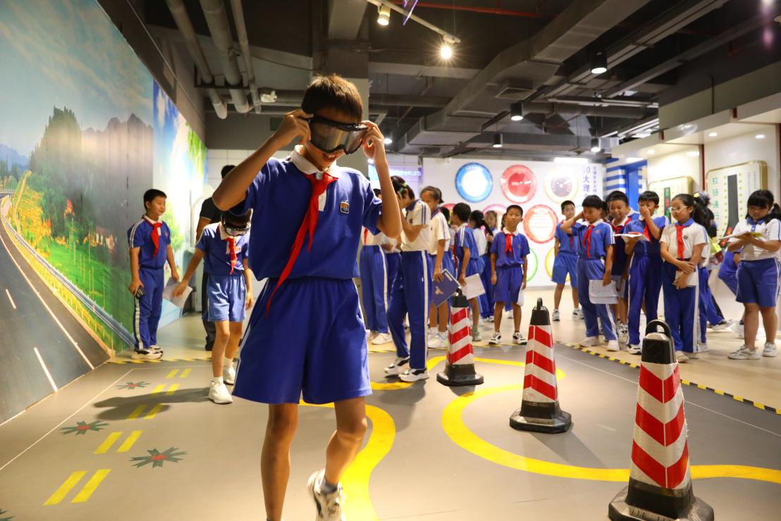 在交通安全馆,学生戴上体验镜,模拟醉酒状态下的驾车行驶;