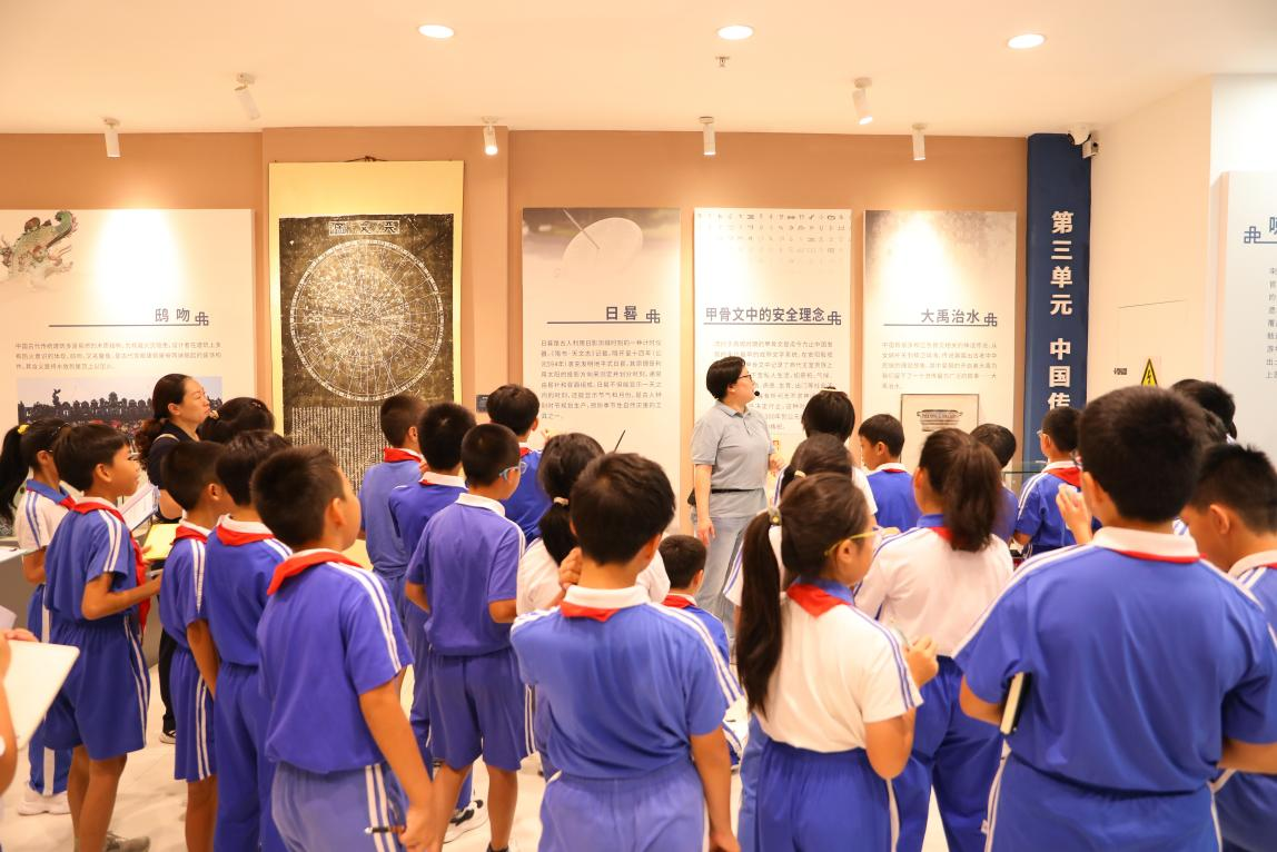 在古代应急展,学生参观学习古代应急知识,参观喇家遗址、遂公盨、青花鸱吻、晚清民国时期消防竹盔等展品,并了解如“抱薪救火”等古代应急成语和典故。