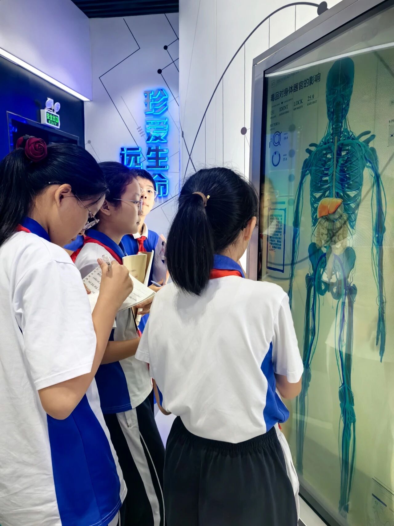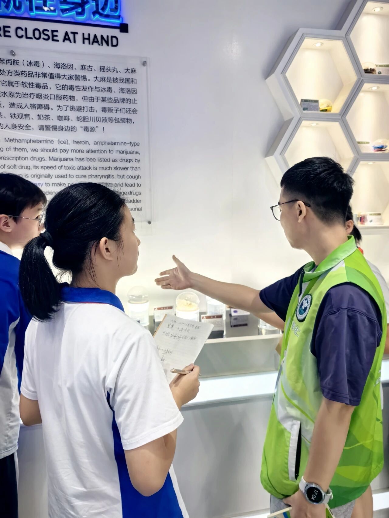 最令我心头一震的,是禁毒展区。那些伪装成“跳跳糖”“果汁饮料”的毒品模型,色彩鲜艳,与普通零食几乎一模一样,却藏着致命的毒牙。展板上,一张张因吸毒而扭曲的面孔令人揪心,讲解员沉重地讲述着:有初中生因一时好奇尝试,从此坠入深渊,身体被摧残,学业被葬送,人生被改写……我的心仿佛被重重击了一下,久久不能平静:生命如此珍贵,容不得半点侥幸。今天的参观不仅是一堂课,更是一次生命的觉醒——安全不是口号,而是我们必须时刻紧握的盾牌。(图文/坂田部团委)