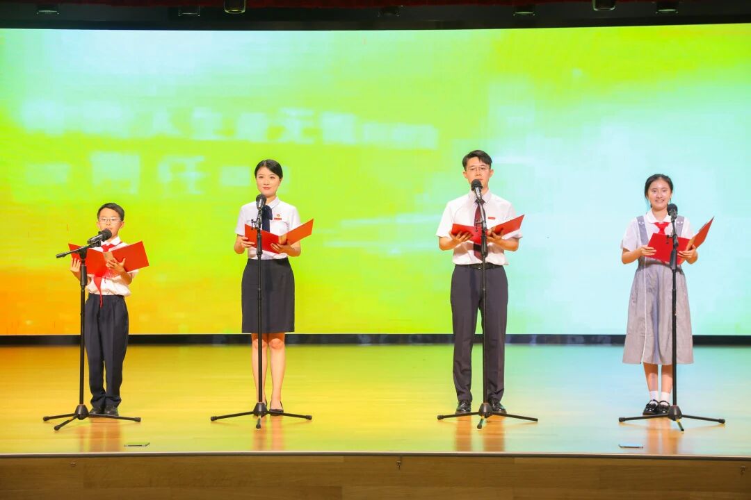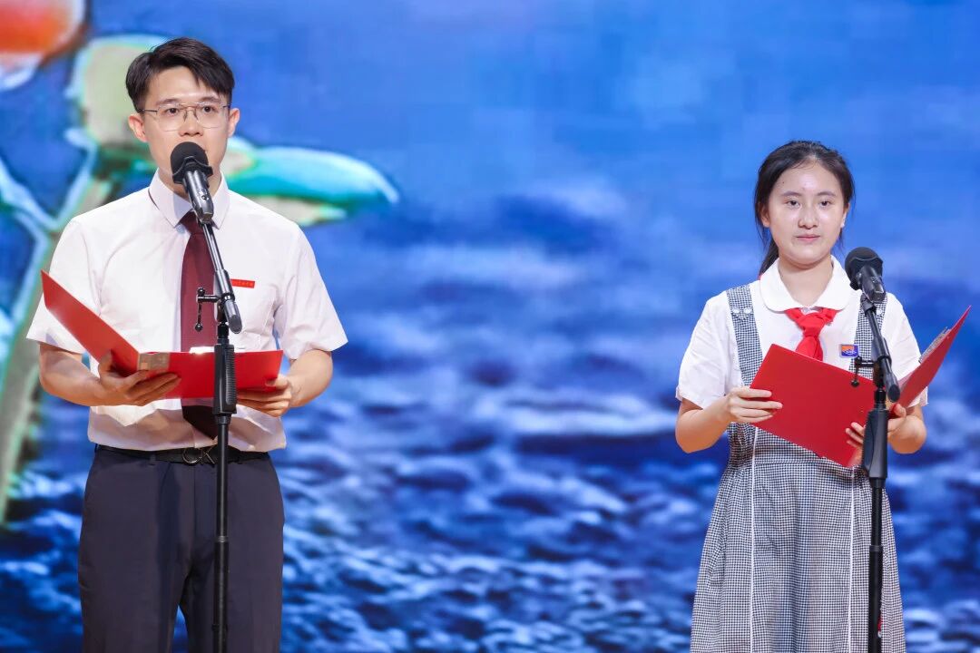 舞台上,师生代表宛如璀璨星辰,联袂带来深情朗诵。教师们被比作灯塔、指南针、烛光、星辰,为学生指引航向、绘制梦想…字字句句,宛如灵动音符,跳跃在校园的每个角落,倾诉着对教师这一职业深深的感恩,展现出师生携手共进、砥砺前行的教育画卷。