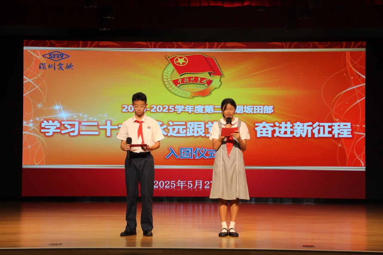 为进一步加强青少年的思想引领,增强团员意识,激励广大中学生坚定理想信念、勇担青春责任,深圳实验坂田部于2025年5月27日隆重举行了主题为“成长蜕变·勇担责任”的八年级离队入团仪式。本次活动是少先队员向共青团员身份转变的重要见证,是同学们人生旅程中一段庄重而难忘的经历。