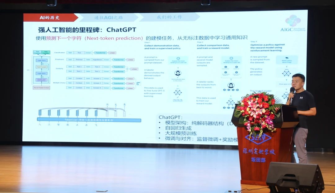 主题分享环节,首位登场的蒋毅敏校友,以“通用人工智能”为主题,带领师生回溯AI起源。他从1950年图灵测试讲起,梳理符号智能、弱人工智能到强人工智能的演进脉络。蒋校友特别强调了“涌现”这一现象,指出当模型参数达到一定程度时,人工智能的能力将实现质的飞跃,如同水分子在特定条件下形成晶体一般。蒋校友的讲解深入浅出,将复杂的技术原理转化为生动的类比,让在场师生对AI的底层逻辑有了清晰认知,更激发了大家对科技前沿的浓厚兴趣。