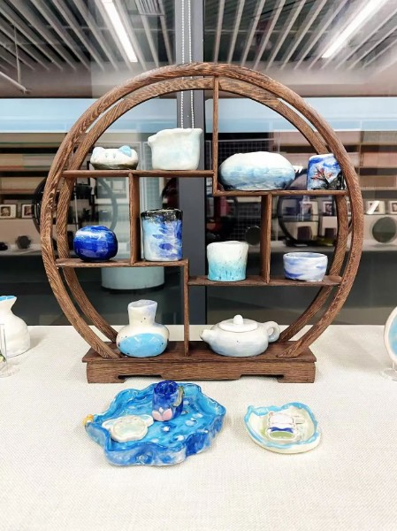 今年成立的“陶然”陶艺社团由杨楠老师担任指导,学生们以陶土为载体,从拉坯塑形至烧制上釉,指尖的温度赋予泥土以灵魂。同学们在薄胎上重绘原创十二时令花卉图案,以当代青年视角重释千年经典。每只杯子代表一个月份,并配以唐诗诗句、篆书“赏”字印及花卉纹饰,形成“一月一花一诗一画一印”的独特设计。同学们的作品不仅是一次艺术创作,更是与传统文化的结合,对非遗的传承和对经典的致敬。