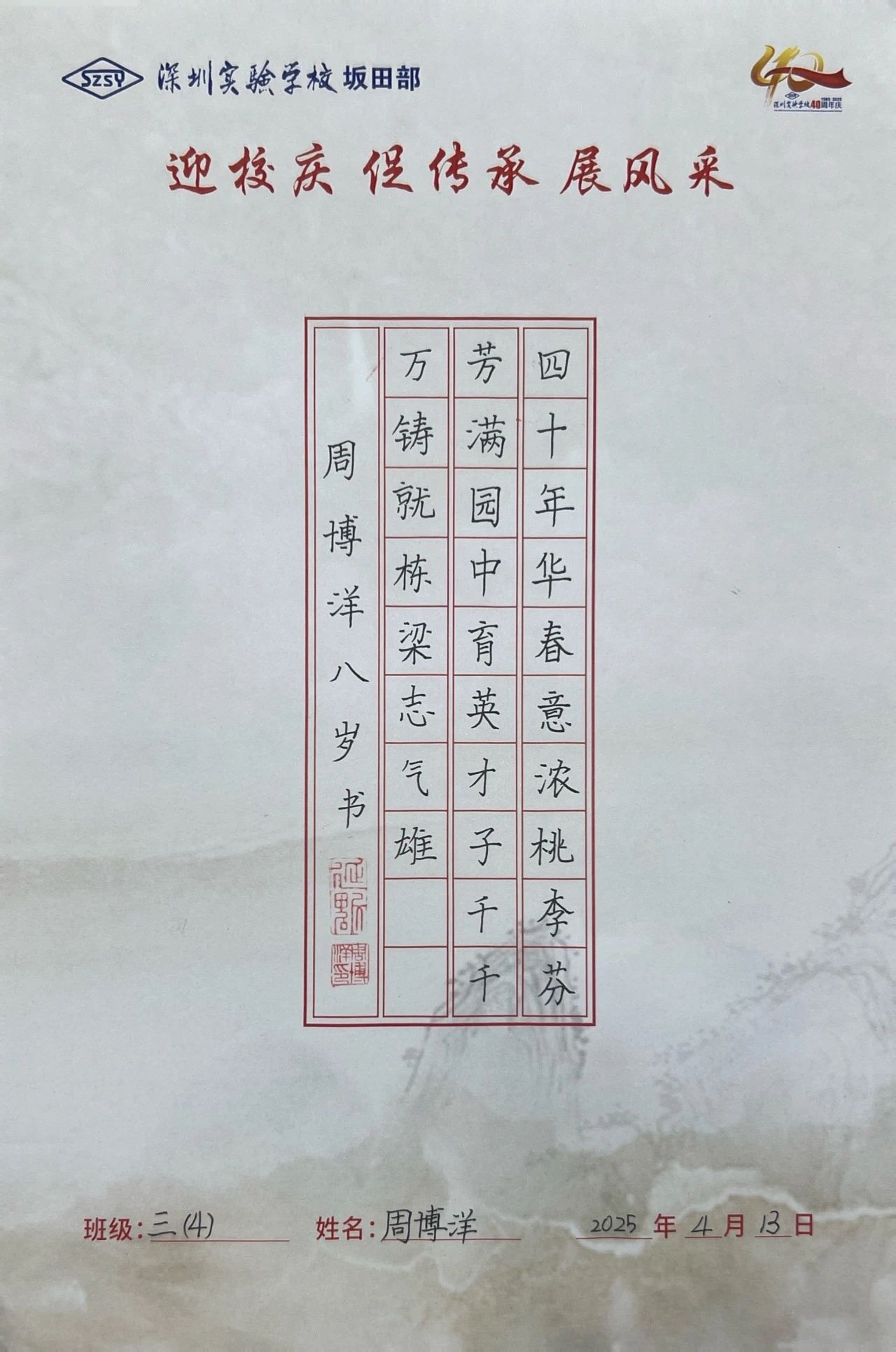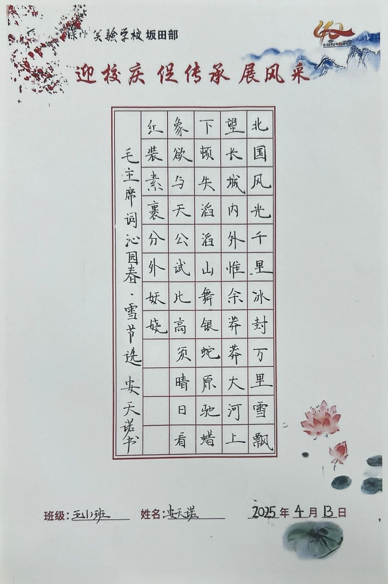 一支毛笔书法社的同学们在庆祝砚池春秋四十载的实验风华少年书中,通过横竖撇捺的间架结构感受汉字的平衡之美,在起承转合的韵律里体会传统文化的深厚底蕴。在静谧的书写中,同学们沉淀了浮躁,随着稚嫩笔触逐渐显现出筋骨,书法正悄然滋养着学生的专注力、审美力和文化自信。期待更多小书法家执笔为舟,在墨海星河中扬帆远航。