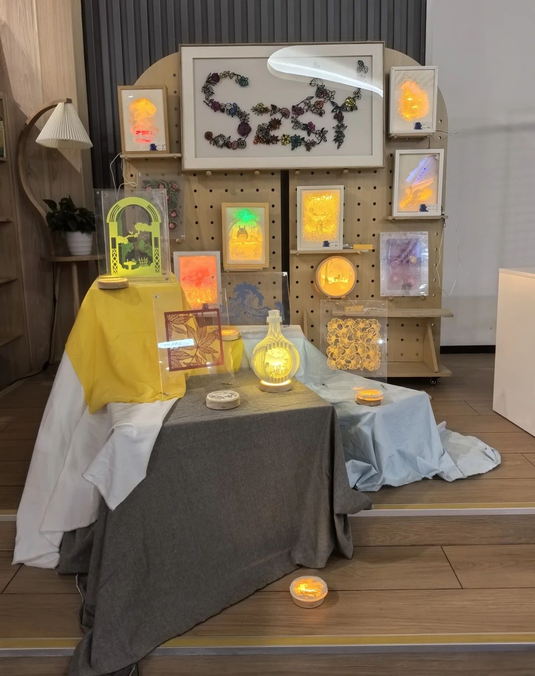 在光影纸雕社团,方芳老师引领着成员们将绘画与手工艺术巧妙融合。本届艺术节以“指尖生繁花”为主题,社团全体成员齐心协力,以校庆40周年为契机,共同创作了一件作品,以此向校庆献礼。展览现场,彩色纸雕与光影装置相映成趣,共同勾勒出传统工艺与未来愿景的交响。