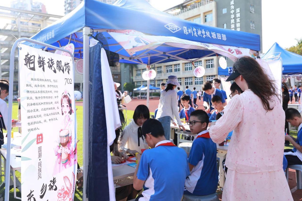 七八年级各班学生和家长们化身“民族文化传承使者”,分别承办着特色鲜明的近四十个民族主题展位,精彩纷呈,创意无限。从民族服饰体验到云端相册留念,从生活物品的手工制作到少数民族文字解密,从民族文化讲解到民族舞蹈观赏、竹竿舞体验、游戏互动……师生们满怀欣喜地穿梭在各班摊位之间,沉浸在各民族文化之中。