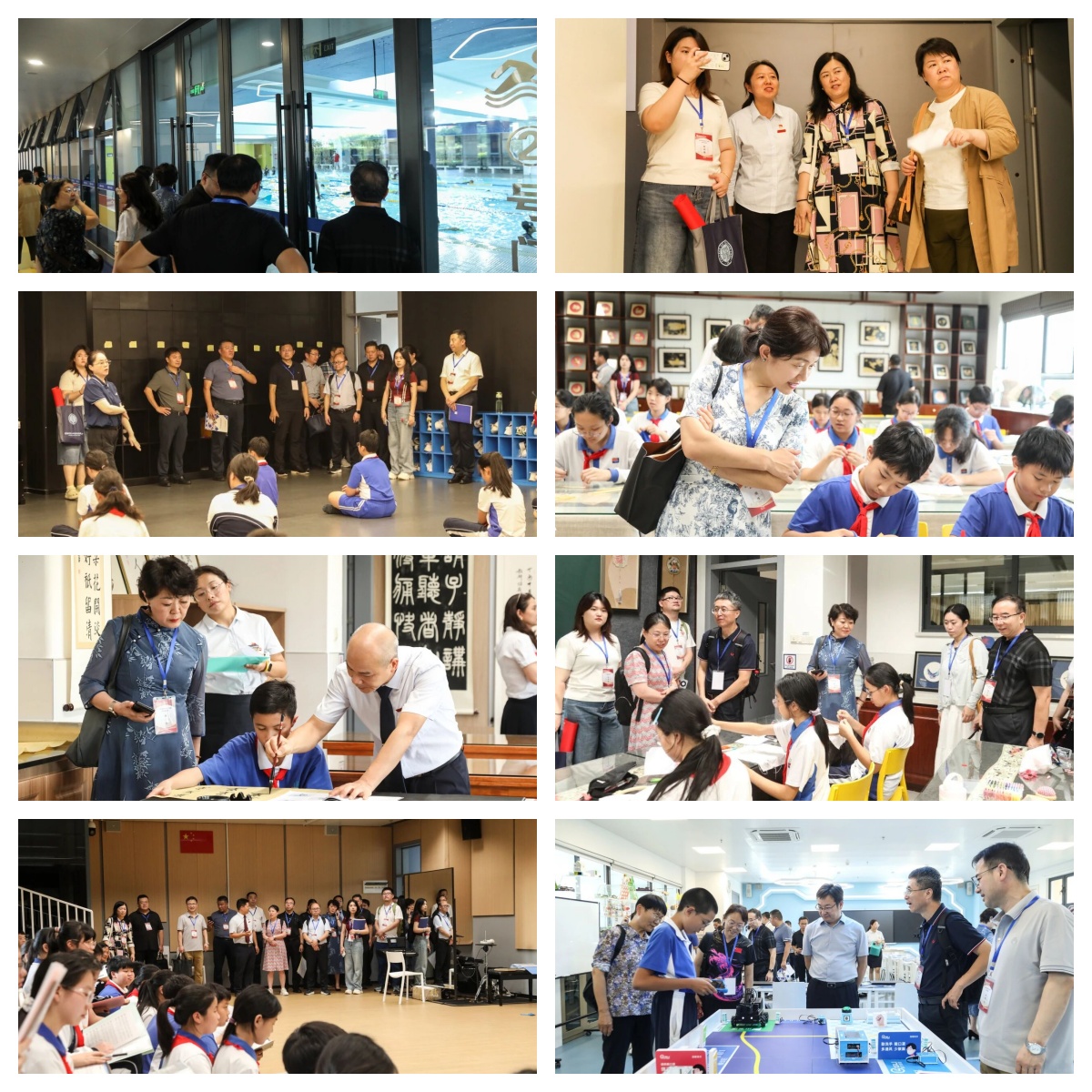 考察团移步初中,在一楼游泳馆和舞蹈教室,学生们展示了游泳课与形体课的规范训练;二楼戏剧社精彩演绎青春风采;三楼麦金画、书法、刺绣、合唱等传统与现代交融的社团项目,尽显校园文化深厚底蕴;科创室的科技项目演示,则生动展现了学生创新思维与动手能力的深度融合。