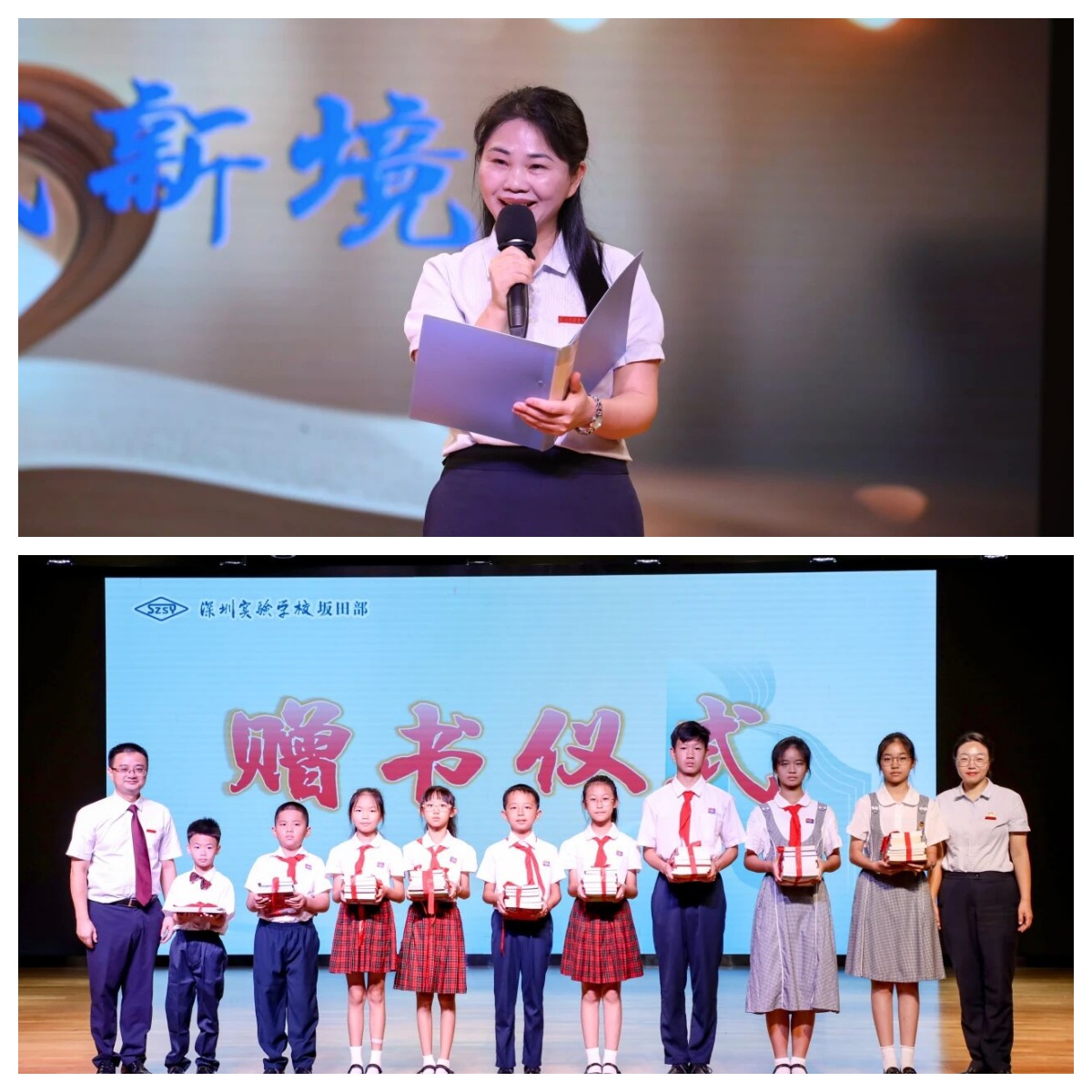 随后,深圳实验学校坂田部副部主任叶伟生、赵晓为一至九年级学生代表赠书的环节,更将仪式感拉满。接过书籍的瞬间,孩子们接过的不仅是知识的载体,更是学校“世界即学校,自然即教材”的育人理念。