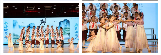 二(9)班的同学们身着雅致服饰,以清脆童声吟唱《声律启蒙·一东》。“云对雨,雪对风,晚照对晴空”,朗朗上口的韵律在报告厅回荡,文字瞬间有了温度,也让在场师生感受到中华传统文化的独特魅力。