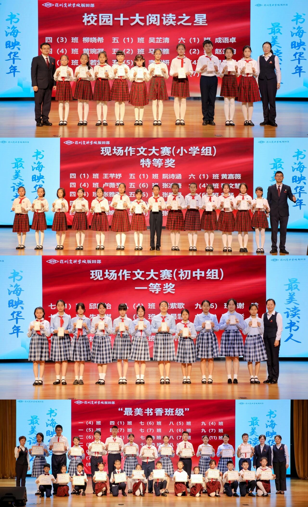 在读书月的旅程中,许多同学以书为友,勤于思考,用行动诠释“最美读书人”的含义;不少班级凝心聚力,营造出浓厚的书香氛围。闭幕式上,这些闪耀的“阅读之星”与“书香班级”,迎来了属于他们的荣誉时刻。在同学们的期待中,小学部“十大阅读之星”上台领奖,叶伟生主任、赵晓主任为他们颁发奖状,表彰他们在阅读中的坚持与积累。