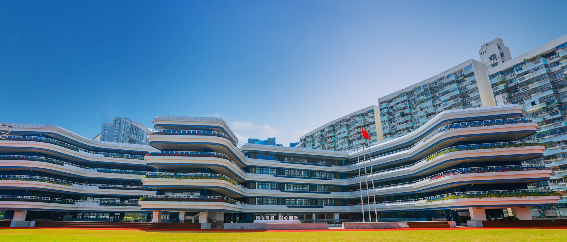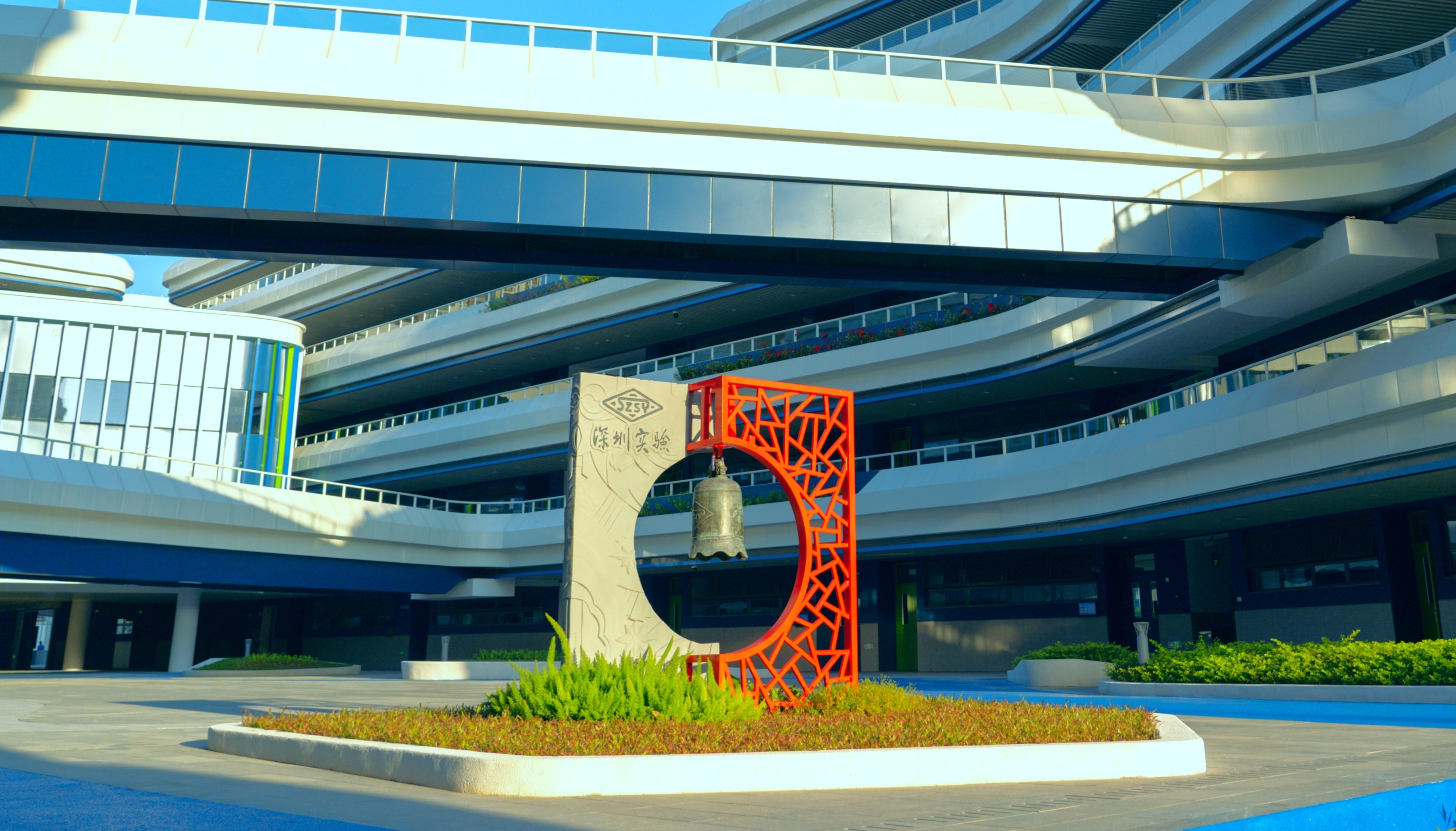 深圳实验学校初中部肇基于1986年创立的华强中学,1998年合并到深圳实验学校,是深圳市省一级学校。于2019年拆除重建,2023年以崭新姿态原址回迁。新落成的校园占地2.4万平方米,总建筑面积6.1万平方米,多层次、环绕式、复合型的建筑布局,构建起蓝白相间、绿植环绕、自然灵动的立体教育空间。12层综合楼与6层教学楼交相辉映,包含可容纳900人的大型报告厅、三层开放式图书馆、双层运动场、恒温游泳馆、师生综合活动中心以及航天、航海、音乐、美术等各类科创、文创特色化教室,教育、教学设施齐备。