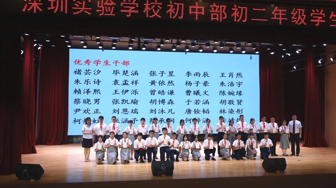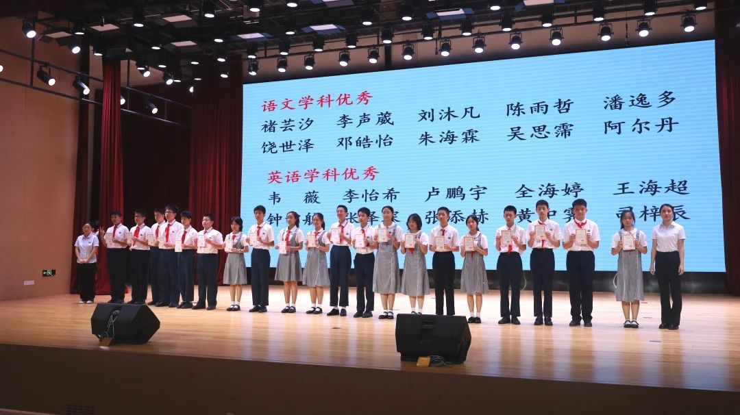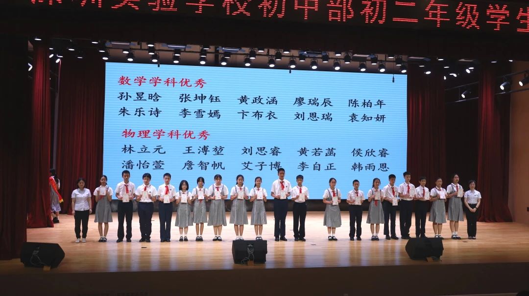 大会最后一项是激动人心的颁奖时刻。经过一年的不懈努力,初二年级涌现出了一大批在学科学习和班级管理上表现突出的同学,教务处邰士剑主任和彭伟琼主任为学业优秀生和优秀班干部颁奖。