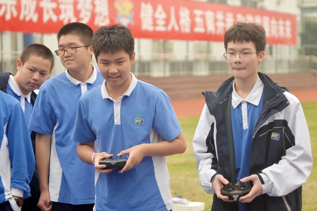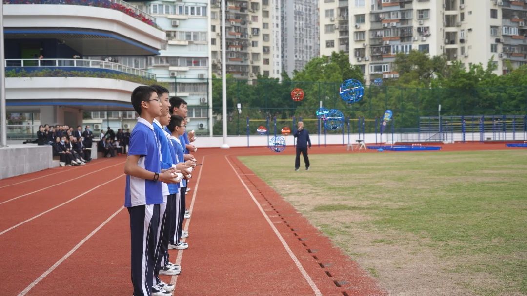 初中部航模队同学上场后,娴熟操控着足球无人机,流畅穿过球门,在操场上空自由飞行,引得现场的同学们欢呼喝采。