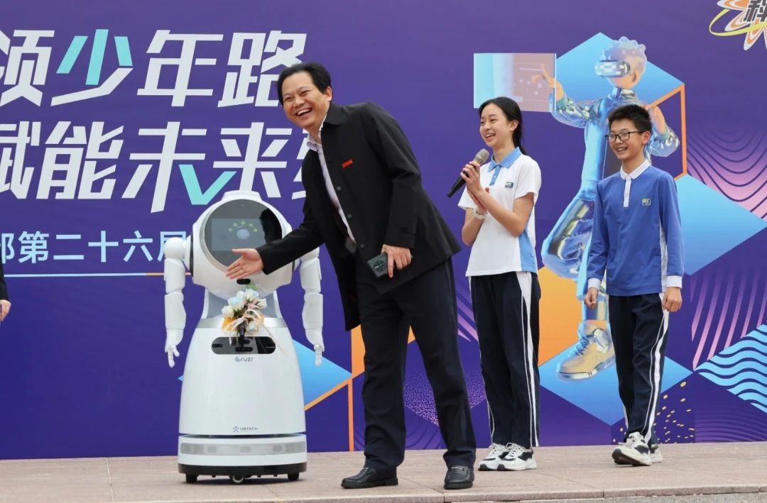 学校邀请了优必选公司带来机器人互动表演。克鲁泽登台后向同学们挥手致意,与夏书记握手,并对夏书记提出的问题实时回答;师生代表也分别与机器人进行互动,并和机器人齐舞,与随后登场的由30台机器人带来的舞蹈《冲向巅峰》,共同呈现科技与艺术的完美融合。