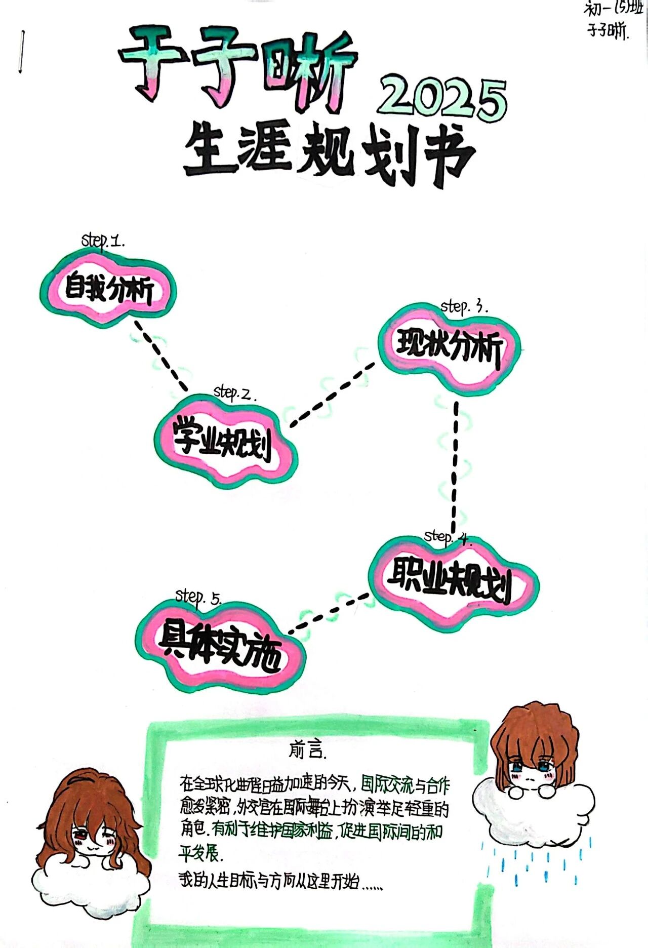 2025年暑期,初中部团委携手心理成长中心组织了“职见未来·前哨站”生涯规划书设计活动。活动中,同学们为自己设计了个人职业生涯规划书:全面的自我分析、清晰的学习规划、分阶段职业规划、以及当下的具体实施行动。