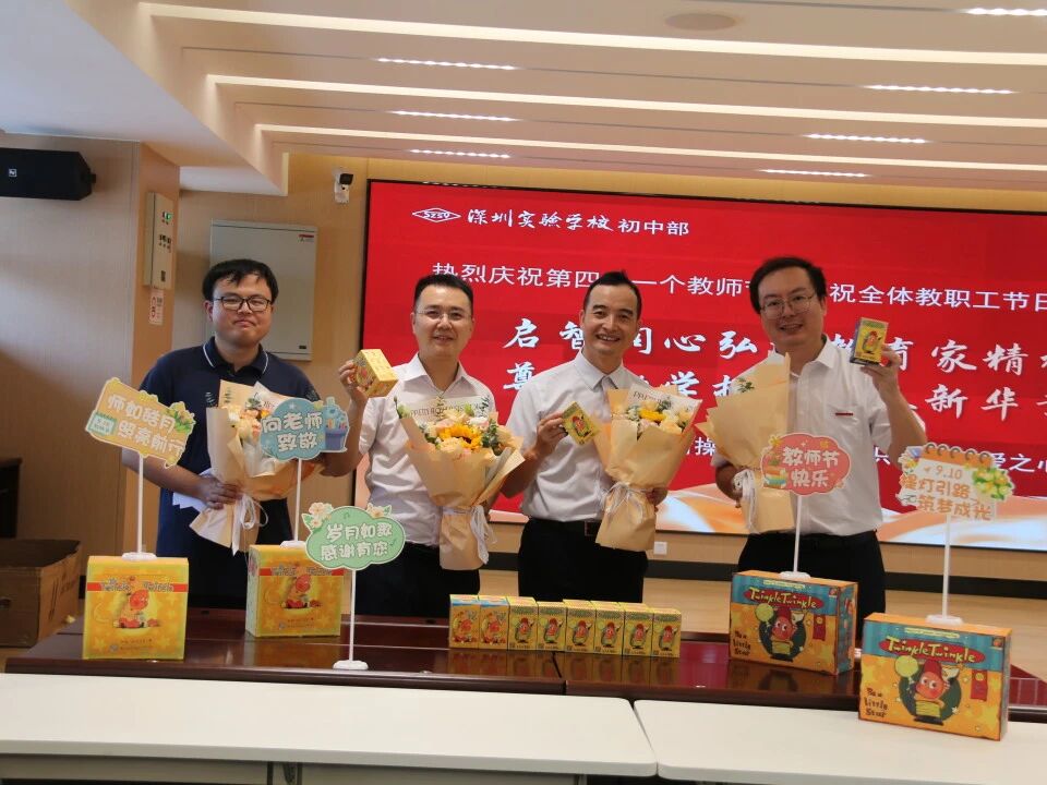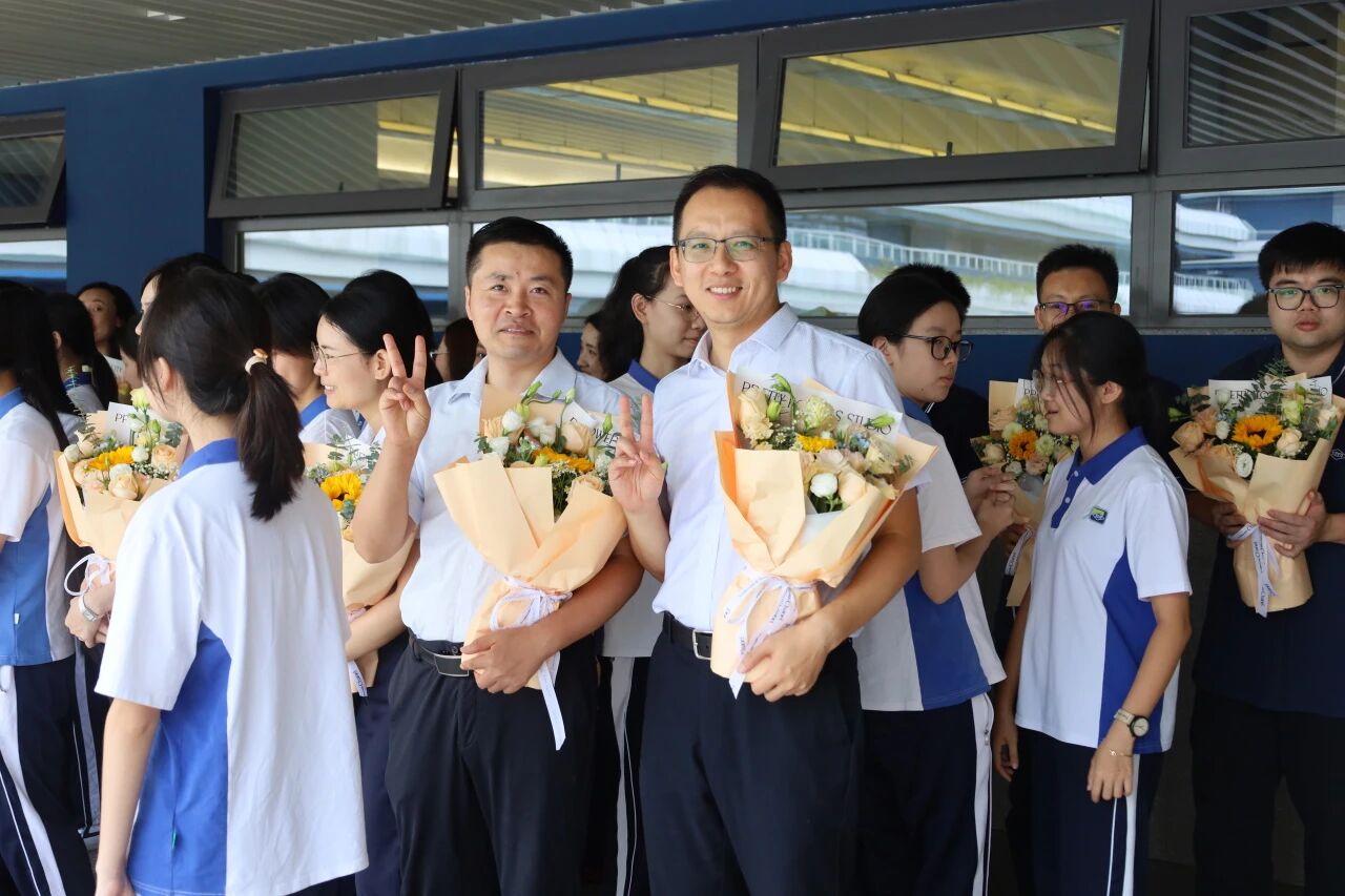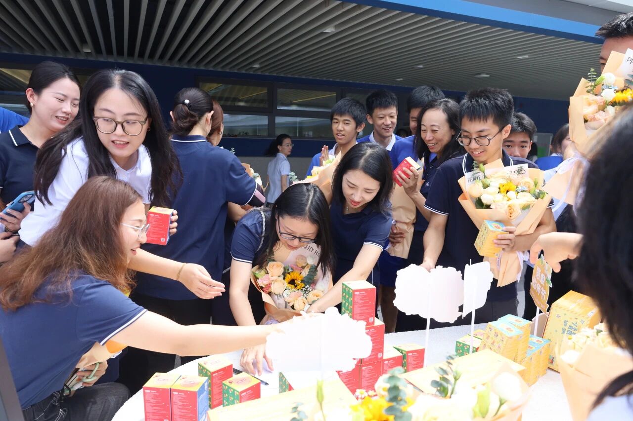 9月10日上午,学生代表手持鲜花守候于喷泉池边、办公室前,盼望着老师们的到来。师者如光,永远向阳。初中部选择象征着阳光与启迪的向日葵花束,寓意老师用知识和智慧照亮学生人生道路,给予学生温暖和力量。鲜花缀着晨露,花语饱含尊敬,递花时一句句“老师节日快乐”、“感谢您的启迪”,师生温情成校园佳景。