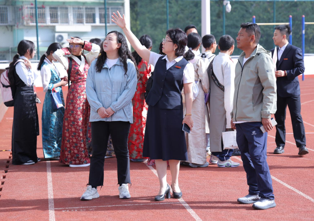 加查县代表团在集团领导及四组接待组组长陪同下参观校园,现代化教学设施与文化长廊令西藏师生赞叹。