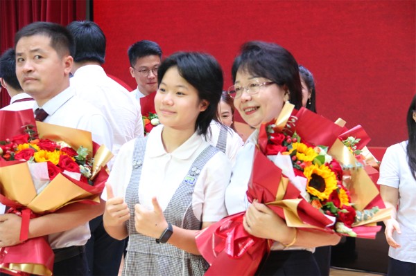 最后,在一曲《我是一颗实验的种子》的歌声中,全体初三教师登台接受优秀毕业生献花,并与全体初三学生握手道别,为三年时光画上了温情的句点!