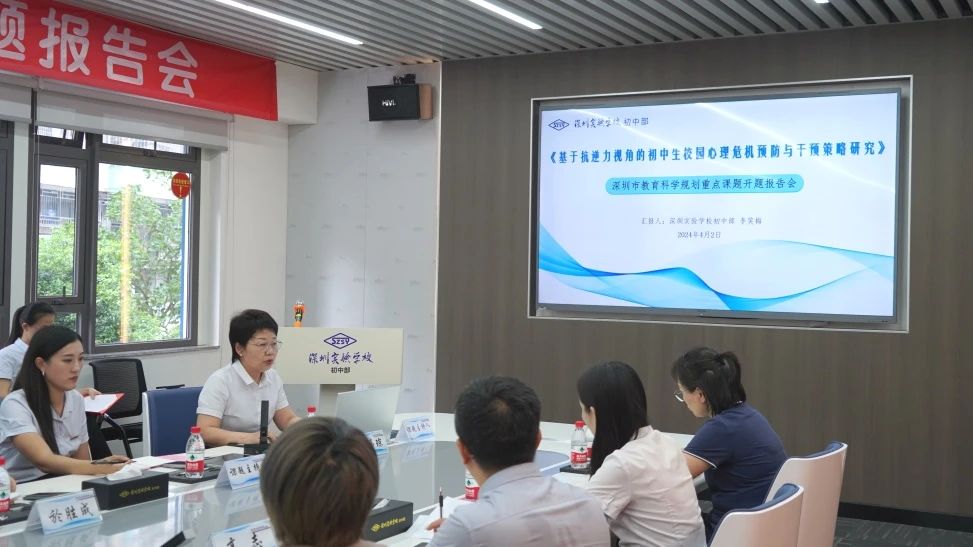 本次会议邀请了深圳大学心理健康教育与咨询中心常务副主任焦璨教授、深圳市龙华区教育科学研究院周东副书记和深圳市教科院心理教研员高志老师担任评议专家。初中部李笑梅执行校长、集团教育教学部於胜成副主任以及课题组全体成员参加了会议。会议由初中部教务处彭伟琼副主任主持。