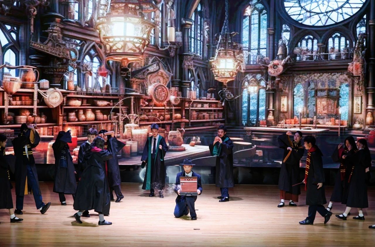 初二(1)、(5)班同学倾情演绎的《哈利·波特与魔法石》拉开了演出的帷幕。罗恩一家穿越九又四分之三站台,开启魔法世界之旅;火车上罗恩、哈利、赫敏初遇,铁三角友谊之花悄然绽放;霍格沃滋新生分院仪式庄重神秘,各展风采;魔法课与魔药课趣事连连,令人捧腹。剧情结构紧凑,演员激情澎湃,舞台效果力量与艺术尽显,让观众仿佛置身于真正的魔法世界,收获沉浸式的剧场体验。
