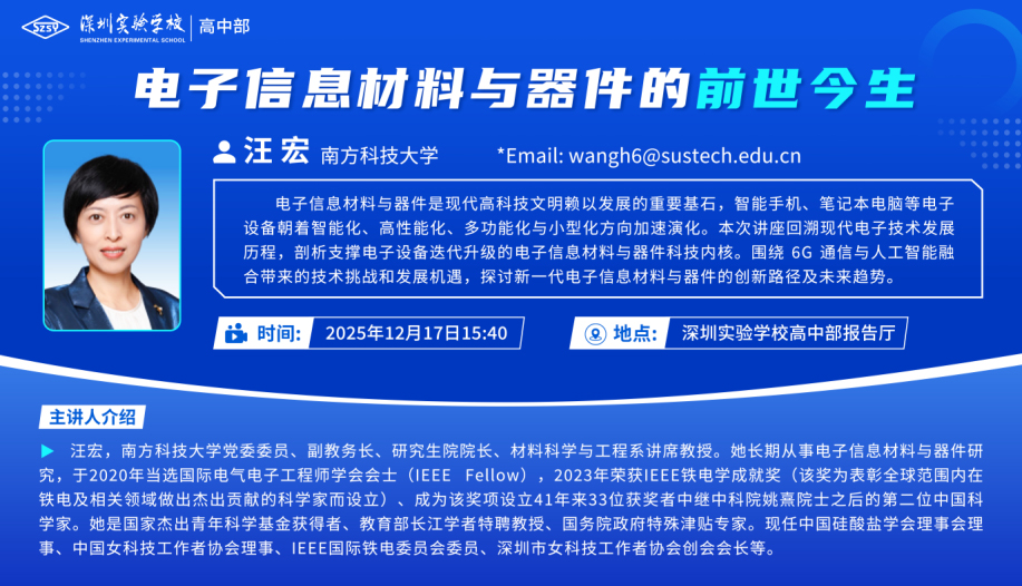 2025年12月17日下午,南方科技大学党委委员、副教务长、研究生院院长、材料科学与工程系讲席教授汪宏,走进深圳实验学校高中部报告厅,为高二年级学子带来了一场别开生面的电子科技启蒙讲座。作为全球材料科学领域顶尖专家、IEEE国际大奖获得者及青年女性科学家杰出代表,汪教授的到访受到同学们的热烈欢迎。