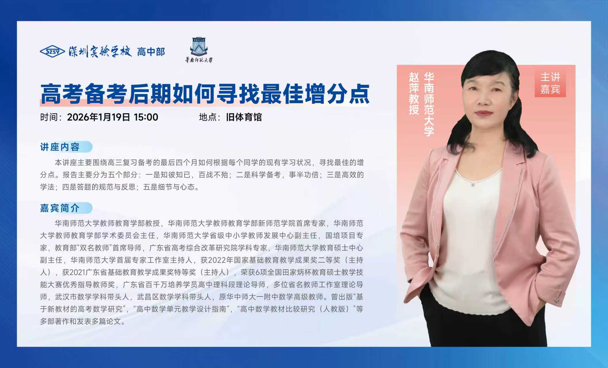 2026年1月19日,华南师范大学赵萍教授莅临我校,为高三学子带来关于数学冲刺备考的指导讲座。赵萍教授长期深耕高考命题研究与教学实践,对高三数学学习有深入研究。讲座中,赵教授系统梳理了四大增分关键领域,直击当前高三学生备考痛点。