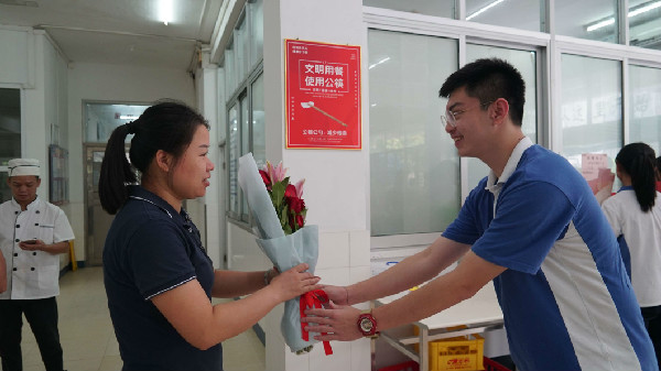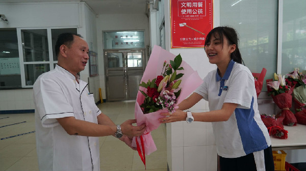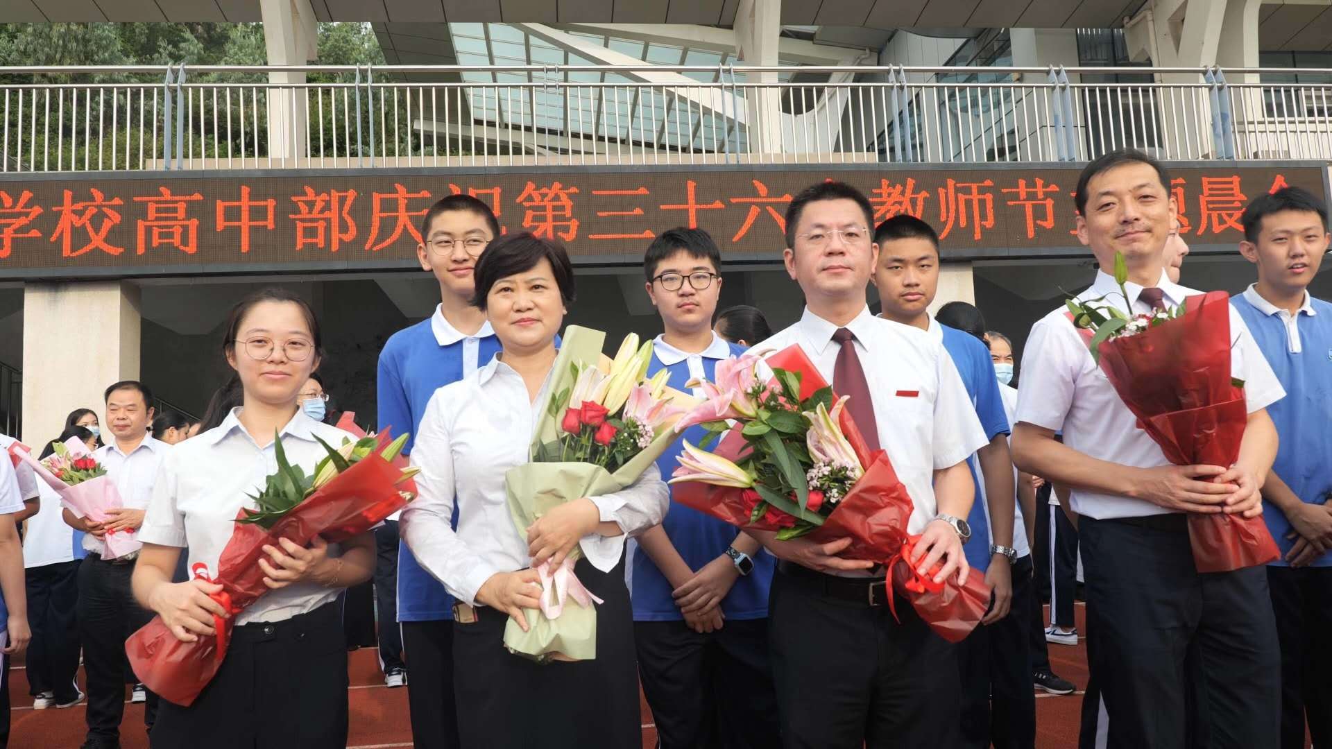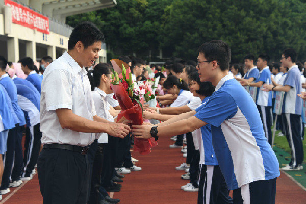 爱就要大声说出来,全体同学大声对老师们喊道:“祝老师们节日快乐!老师,您辛苦了!老师,我们爱您!”他们用最真挚、最朴实的语言,感谢实验敬业的老师们,因为正是满腔热忱的他们,绚烂了实验如火的发展。感谢实验优秀的老师们,因为正是执着追梦的他们,谱写了教育最美的华章。教职工们举起鲜花,挥手向同学们致意,感谢同学们的爱与祝福。