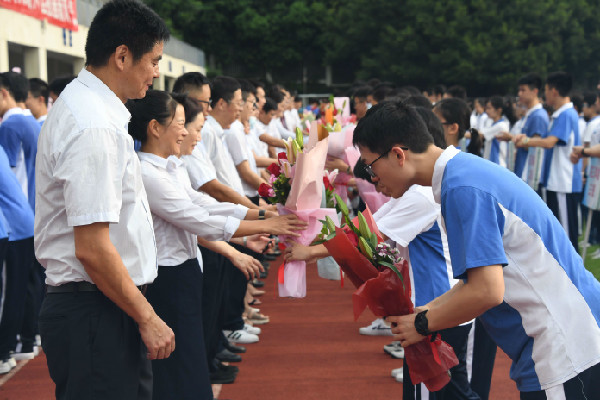 随着《每当我轻轻走过你窗前》动人旋律的响起,高一新生代表为所有的教职工们送上了鲜花。一喻老师德馨为师,身正为范;二祝老师春色满园,桃李天下!娇艳欲滴的鲜花中饱含了实验学子对所有教职工们兢兢业业、勤勤恳恳,几十年如一日辛劳工作的感恩。老师们收下了学生们捧来的芬芳心意,逐一回礼,场面十分温馨。