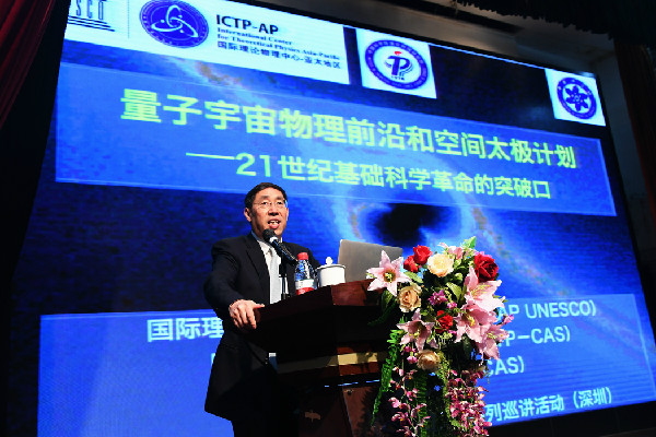 李阳主任首先介绍了吴岳良院士的研究方向和主要成果,伴随着同学们热烈的掌声,吴岳良院士为我校师生作了《量子宇宙物理前沿和空间太极计划——21世纪基础科学革命的突破口》的主题报告。
