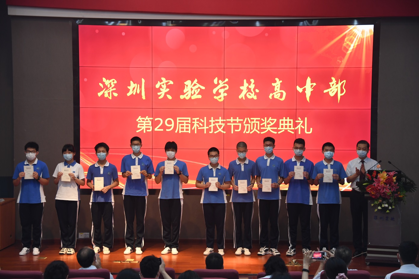6月22日晨会,在热烈的掌声和激昂的音乐中,高中部第29届科技节优胜班级、科技之星、单项奖获奖代表依次登台领奖,李震宇副校长、教务处刘盛举、李阳两位主任分别为获奖同学颁奖。