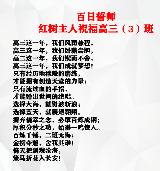 孩子十年磨一剑,或许高考将能改变你的一生。没有比脚更长的路,没有比人更高的山。永往直前路永远在脚下,永往直前你永远是最高的那位,相信自己,一切皆有可能,爸爸妈妈也相信你。加油!——高三(3)班家长