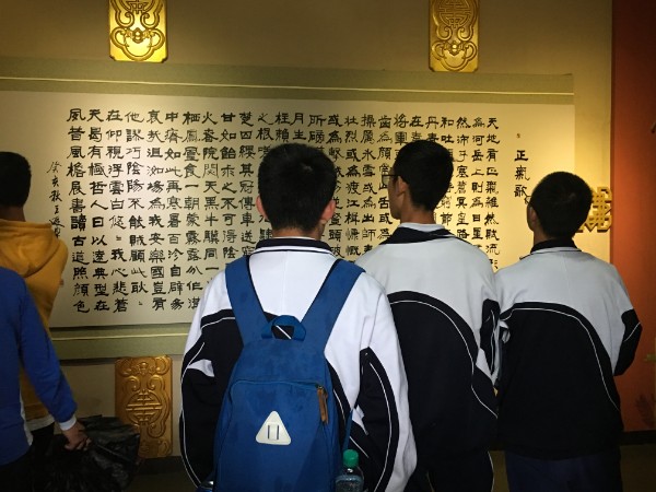 实验学子沉默深思行走其中,每一处朱红的墙角旁,每一处滴水的屋檐下,都是浩然正气依然游走激荡的地方。展厅里的《衣带赞》《正气歌》,还有那尊傲立山脚之下面朝南方的石雕,给我们留下了深刻的印象与思考。
