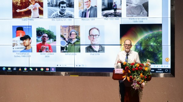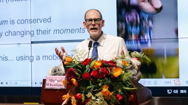 上午11点10分,Michael Wheatland教授步入会场,全体学生报以热烈掌声。教授热情地介绍了自己的个人经历,再引入与自由落体相关的公式与数据,演示了如何利用现代智能手机中的三轴微机电系统(MEMS)陀螺仪进行自由落体实验。从手机中的传感器到手机X、Y、Z三轴的旋转的现场实验,再到这个现象有关的各种生活应用,如滑板、跳水等,Michael Wheatland教授深入浅出地让同学们明白物体不能稳定绕轴旋转这一科学道理,让学生们了解到大学物理课程的基础知识。Michael Wheatland教授用生动有趣的语言、简明扼要的视频资料,把物理实验带到了日常生活中,使同学们对物理的热爱与认知更进了一步。现场同学们始终保持思考,氛围轻松愉快。