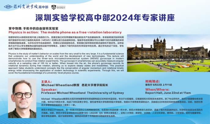 为了将拔尖创新人才的发掘与培育深深植根于基础教育之中,我校于6月22日荣幸地邀请到了悉尼大学理学院副院长Michael Wheatland教授到高中部做客。Michael Wheatland教授为我们带来了一场主题为“掌中物理:手机中的自由落体旋转实验室”的专家讲座。此次讲座旨在点燃学生们对科学的热情,拓宽知识视野,进一步增强创新意识和创造力。在Michael Wheatland教授的引领下,学生们将领略到物理的深邃与美妙,为未来的科学探索之路奠定坚实的基础。