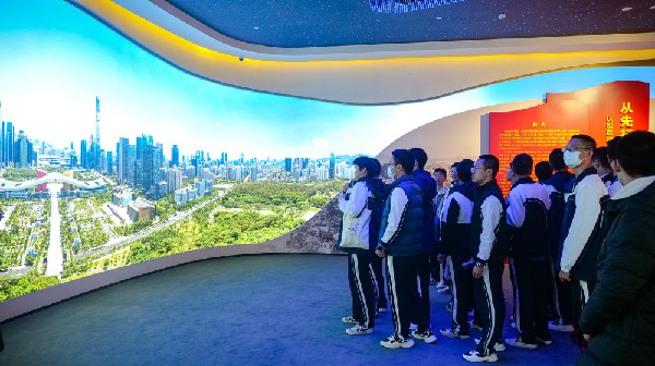 走出校园,步入前海。映入眼帘的是蓝绿交织、山海融城的现代化生态新城景象。思政课的第一站是前海国际会议中心,团员们参观了“从先行先试到先行示范——庆祝深圳经济特区建立40周年展览”, 展览以时间为轴线,以主题为节点,以图片、视频、实物等多种形式展示了深圳经济特区从无到有、从小到大、从弱到强的历史变迁和成就。展览分为四个部分,第一部分集中展示深圳经济特区建立40年的发展历程,第二部分展示新时代深圳经济特区的改革发展成就,第三部分展示深圳推进大湾区建设成效,第四部分展示深圳先行示范区建设进展,展示经济、社会发展“双胜利”的工作成效。同学们在观看展览的过程中感受到特区中的“特区”创新发展成果和先行示范再出发的示范区精神,增强了责任感和使命感,激发了爱国之情、强国之志。