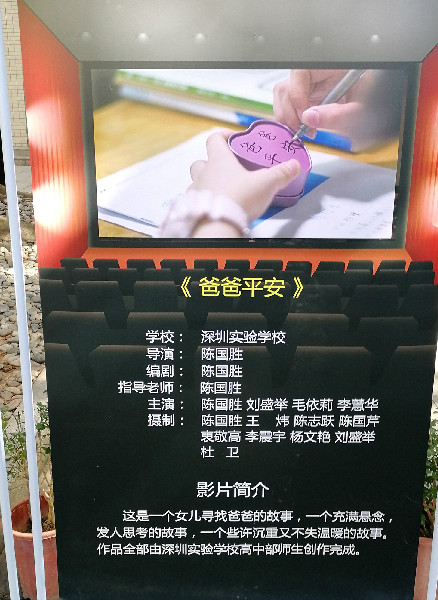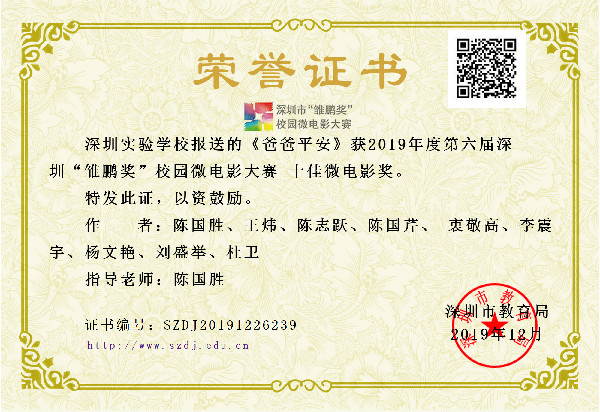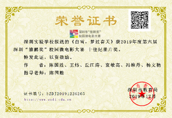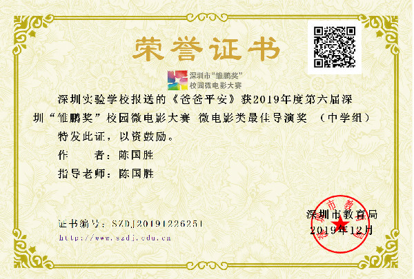 2019年12月20日,第六届深圳“雏鹏奖”校园微电影大赛颁奖大会在深圳市美术学校举行。我校微电影《爸爸平安》获深圳市十佳微电影奖,该片导演陈国胜获微电影最佳导演奖,我校纪录片《白雪,梦过春天》获深圳市十佳纪录片奖,深圳实验学校再次成为唯一获得微电影和纪录片双十佳的学校,并获大赛优秀组织奖。