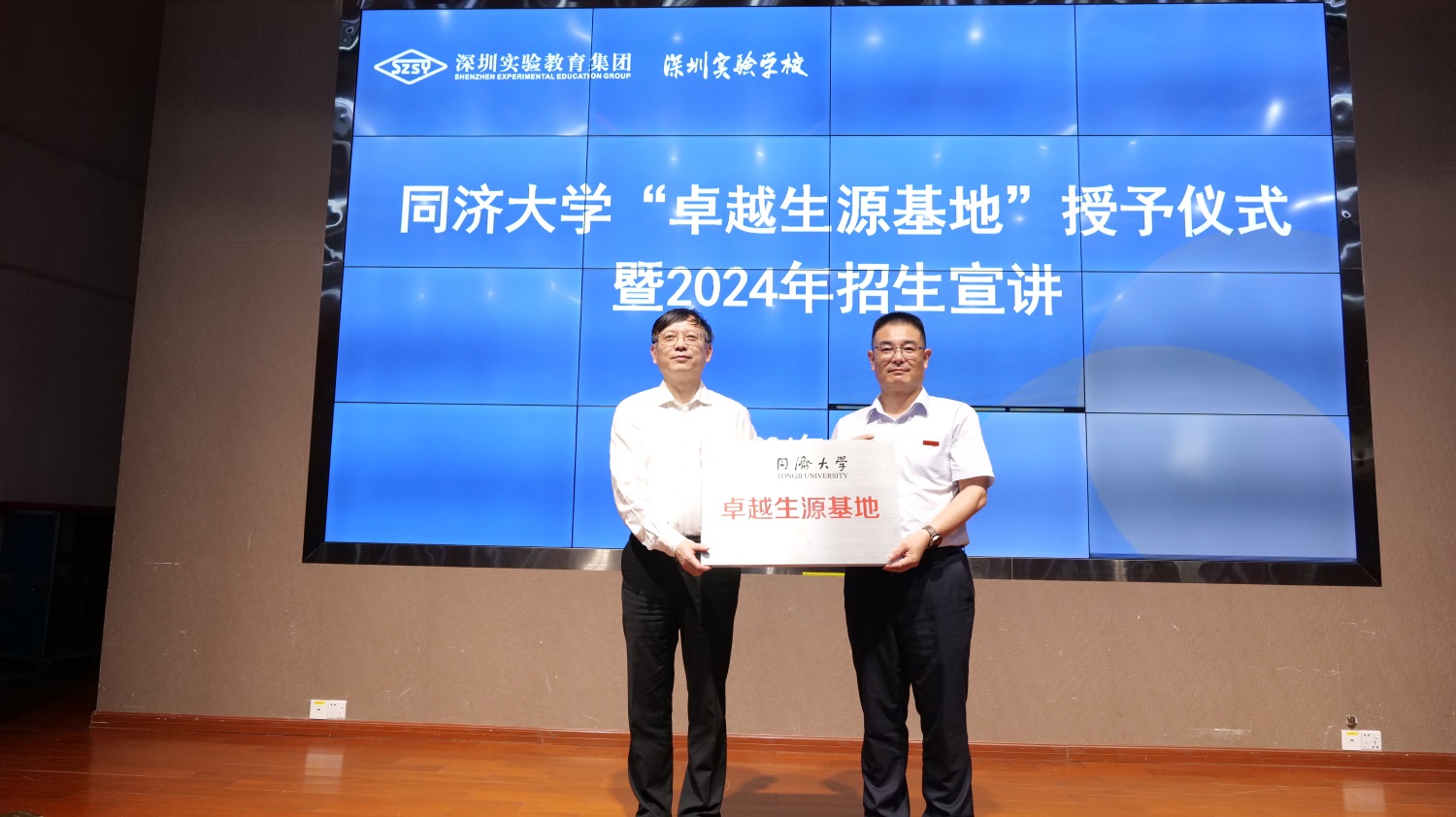 随后,同济大学-深圳实验学校“卓越生源基地”授牌仪式在高中部报告厅举行。同济大学党委书记方守恩教授、深圳实验学校党委副书记、邓旭副校长上台揭牌。牌匾上镌刻的不仅是深圳实验学校与同济大学联合培养优秀学子的成果,更有两校的深厚情谊和对拔尖学子培养的强烈使命感。同济大学党委书记方守恩教授还为高一高二学生及家长带来《选择同济的八个理由》主题讲座。