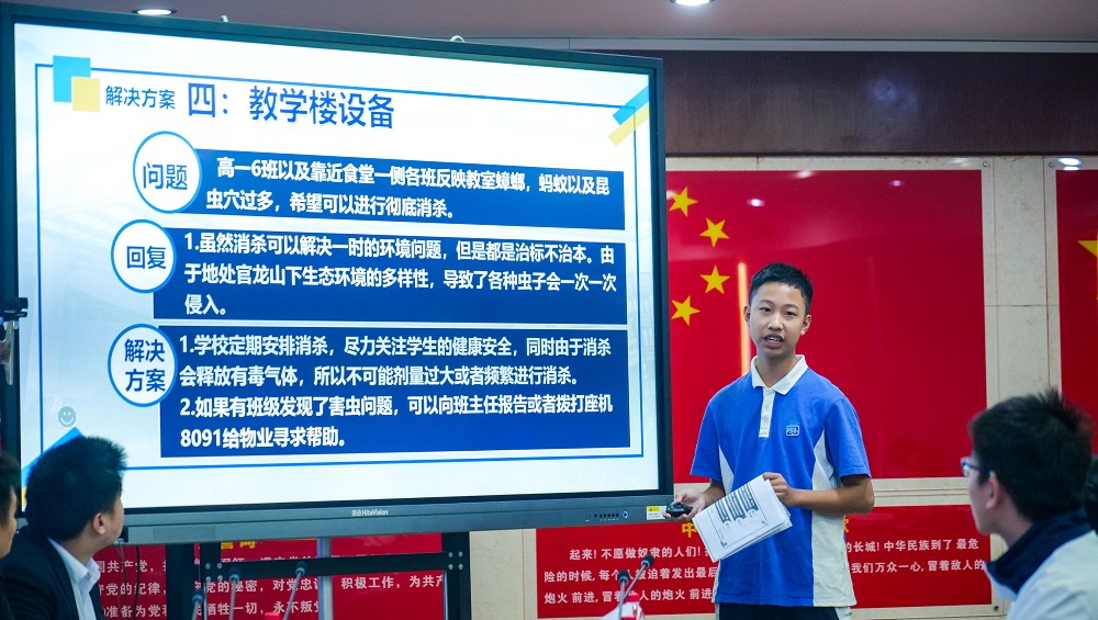 关于食堂的提问,总务处黄月来主任高度赞扬了同学的智慧,认为同学们的提到的按照不同的需求安排份量的建议非常好,食堂也会积极行动起来,满足同学们合理的需求。对于晨练这一问题,学生处林进太主任回应道:之前试行暂停晨练反而使得同学们不吃早餐迟到的现象增加,因此晨练在达到锻炼目的的同时也督促同学们早起就餐。同学们反馈的夏天高温天气晨练会导致出汗较多的问题,林主任希望同学们能够提出更好的解决方案,只要满足提升学生体质和督促学生早起就餐,学校乐于接受意见。针对图书馆图书上新的建议,教务处李阳主任表示教务处已经联合团委学生会调查同学们喜欢的图书,并结合深圳读书月活动推荐书目购置了一批新书,后期将每学期进行图书更新,欢迎同学们借阅。关于校医室药品种类少的问题,办公室吴平波主任解释了由于政策要求医务室不具备处置病情的资质,只能够提供少量的常见药物应急,学生身体不适还是需要第一时间到医院就医。