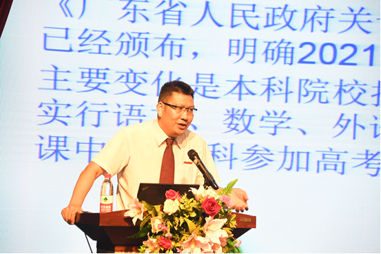 高中部副部主任、教务处田祚鹏主任结合其他省份高考改革实际情况,就新高考科目选择、考纲要求、考试时间,计分方式,评分方式、专业覆盖率等方面进行了详细的解读,让家长更加清晰地认识新高考;同时也就高中部选课走班的具体操作提出了规划。