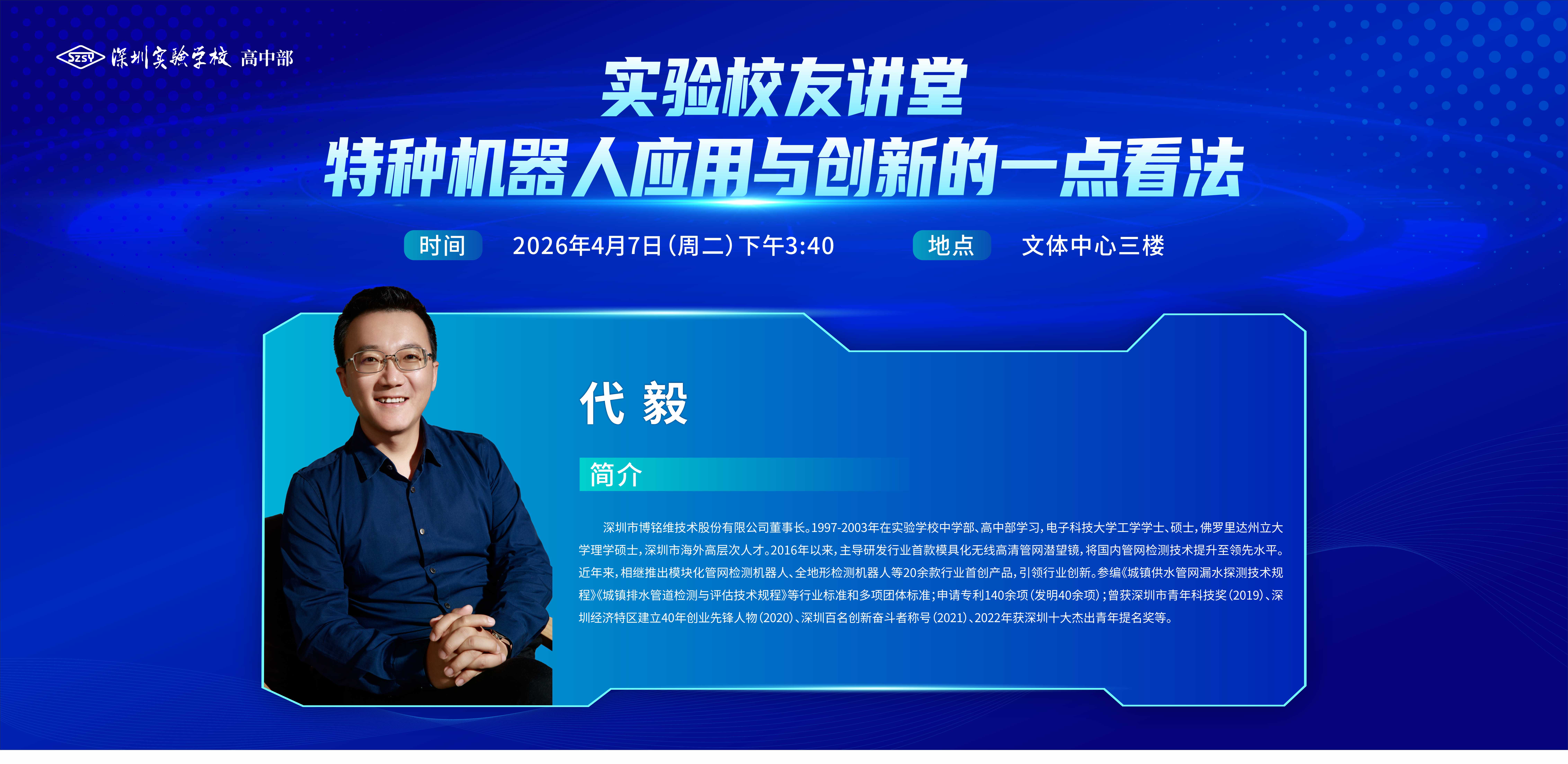 本次校友讲座的成功举办,不仅为高中部学子打开了一扇了解特种机器人行业的窗口,更生动诠释了深圳实验学校“以爱国主义教育为基础的健全人格教育”的办学理念。作为“实验之光”校友群体中的杰出代表,代毅学长的成长历程与创业故事,为在校学生提供了宝贵的精神坐标。