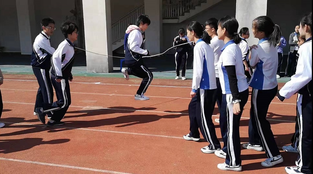 脚底轻掷地,手绳翻无影。个人赛结束后紧接着是班级集体赛——八字跳绳。各个班级旗鼓相当,也都争分夺秒地练习着。裁判员计时开始,每一个班级竞相喊着自创的口号极力让班级的数字上涨,“万众一心”一词的释义在此处被体现得淋漓尽致。观众的心弦也和运动员们一样紧绷着,一边担心运动员不慎被绳绊倒又暗自期待着最高极限的出现。