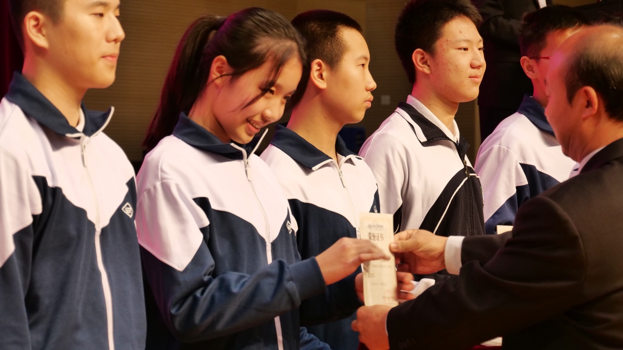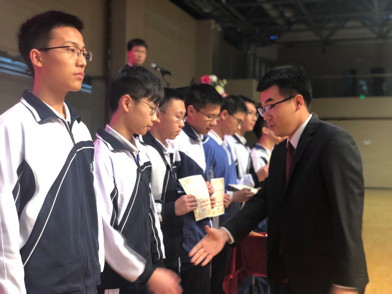 会议伊始,高中部副部主任、教务处田祚鹏主任和教务处李阳主任为在第十五届“泛珠三角奥林匹克暨中华名校邀请赛”中获奖的同学颁奖。这些同学在竞争激烈的竞赛中表现超群,斩获佳绩。他们整整齐齐站了一排,他们是同学们的榜样,是实验精神的体现,更是实验人的骄傲,祝贺他们!