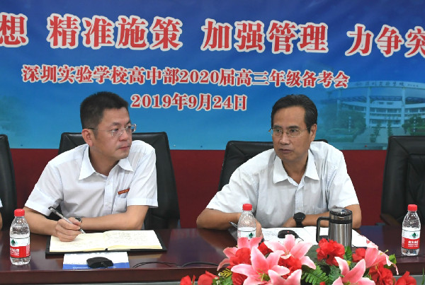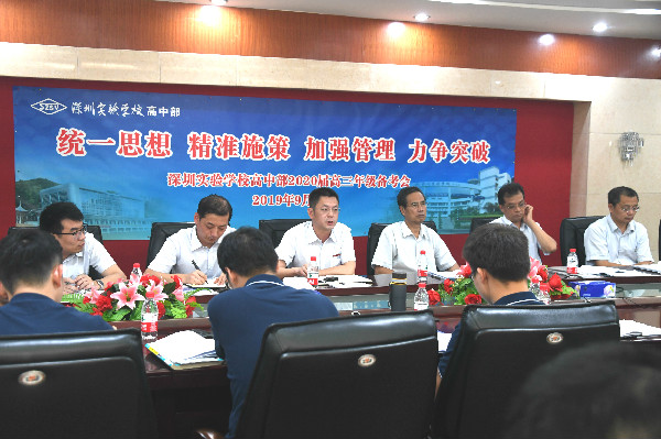 2019年9月24日, 深圳实验学校高中部召开主题为“统一思想 精准施策 加强管理 力争突破”的2020届高三备考工作会议。集团衷敬高校长、教育教学部郭志鸿主任,高中部李震宇校长、刘盛举副部主任、教研处鲍方遒主任、教务处李阳副主任、高三年级李新林主任、周勇主任和高三全体教师参加会议。会议由李阳主任主持。