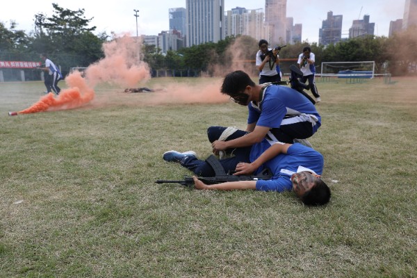 战术演练,英勇无畏。警报响起,战术小队即刻严阵以待。女同学队长高喊一声“注意!”,所有队员迅速弯腰,摆出战斗姿态。紧接着,九名队员分成三组,向前方搜索前进。中间小组遇到障碍,立即低姿穿越,而左右小组则架枪掩护,随后交替通过,动作干练利落。鼓点骤然响起,左边小组已经与敌人接火,迅速制服了两个岗哨。然而,“匪徒”的叫声响起,战斗瞬间升级。就在这时,障碍物后突然伸出了枪口,两名队员猝不及防,“中弹”倒地。队友们迅速投掷烟雾弹进行掩护,并实施救援,同时队长带领其余队员发起猛攻,动作迅速如风。最终,“匪徒”们接连被打死,队员们冲破障碍区,成功救出人质,并挥舞起那面象征着胜利的旗帜。