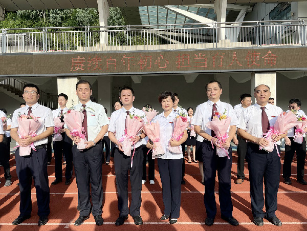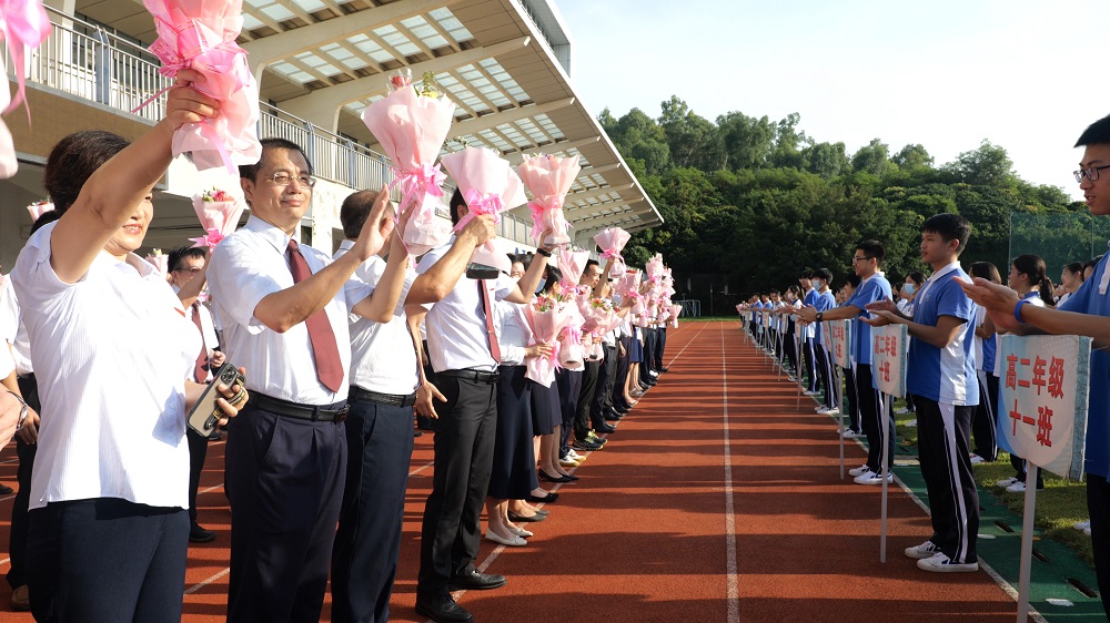 “老师,节日快乐!老师,您辛苦了!老师,我们爱您!”全体同学喊出他们对老师们的深情。因为正是实验老师们日复一日、年复一年的用心浇灌、悉心培育,才有实验学子们的成人成才和光辉前程。教职工们举起鲜花,挥手致意,感谢同学们的爱与祝福。